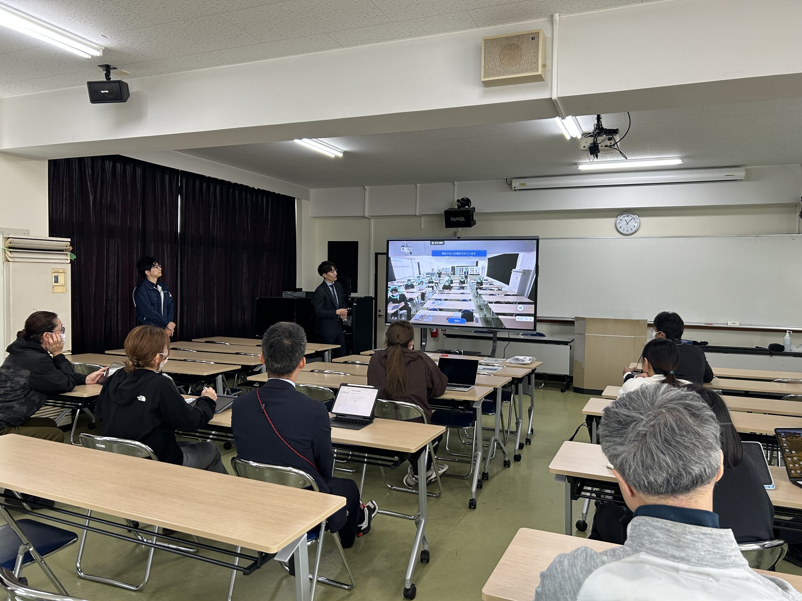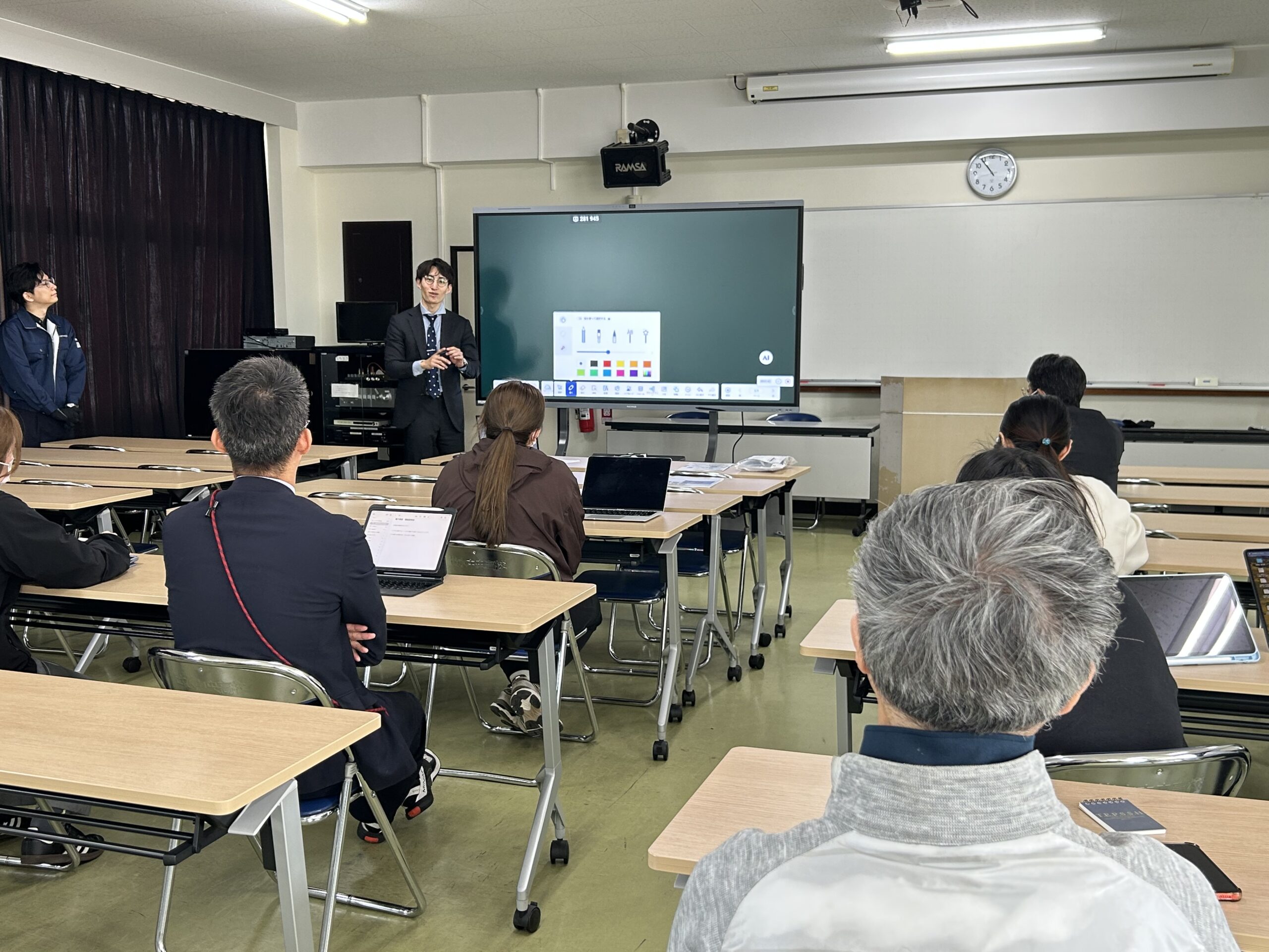 本説明会は、『株式会社久永』様および『ナイスモバイル株式会社』様のご協力のもと実施されたもので、機器の基本機能の説明に加え、実際の授業場面を想定した実機デモンストレーションを行っていただきました。