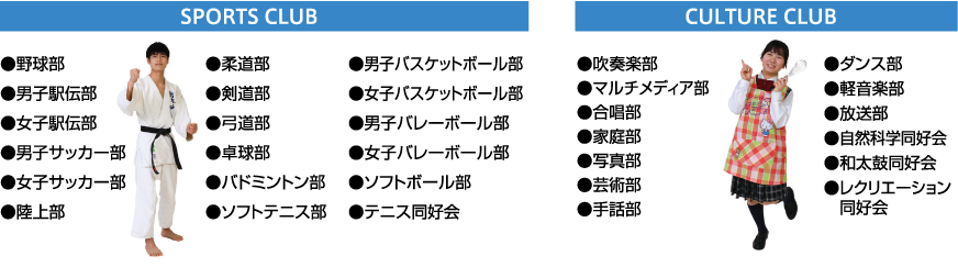 本校には、野球・駅伝(男女)・サッカー(男女)・陸上・柔道(男女)・剣道・弓道・卓球・バスケットボール(男女)・バレーボール(男女)・バドミントン(男女)・ソフトテニス・女子ソフトボール・和太鼓の運動部と、吹奏楽・マルチメディア・合唱・家庭・写真・芸術・手話・ダンス・軽音楽・放送の文化部、テニス・自然科学・レクリエーション・eスポーツ・地域リーダーの同好会があり、放課後の時間を最大限利用してさわやかな汗を流しています。